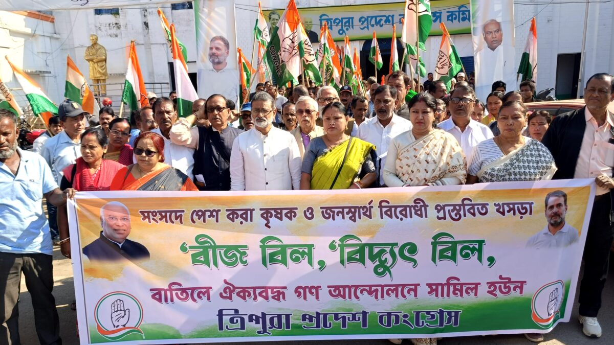আগরতলা:প্রদেশ কংগ্রেসের উদ্যোগে সংসদে পেশ করা কৃষক ও জনস্বার্থ বিরোধী প্রস্তাবিত খসড়া বীজ বিল ও বিদ্যুৎ বিল বাতিলের প্রতিবাদে ঐক্যবদ্ধ গণ আন্দোলনে শামিল হওয়ার আহ্বান জানিয়ে সোমবার আগরতলা শহরে এক বিক্ষোভ মিছিল ও সভা অনুষ্ঠিত হয়।