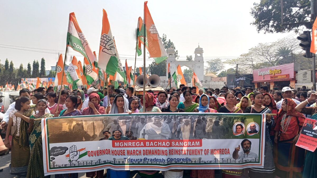 আগরতলা : রাজ্যে রেগা প্রকল্প পুনরায় চালুর দাবিতে সরব হলো প্রদেশ কংগ্রেস। সোমবার আগরতলার বুদ্ধ মন্দির এলাকায় দলের উদ্যোগে এক বৃহৎ জনসভার আয়োজন করা হয়। সভায় বিপুল সংখ্যক দলীয় নেতা-কর্মী ও সমর্থকের উপস্থিতি লক্ষ্য করা যায়। সভামঞ্চ থেকে কেন্দ্র ও রাজ্য সরকারের বিভিন্ন নীতির তীব্র সমালোচনা করেন কংগ্রেস নেতৃত্ব।