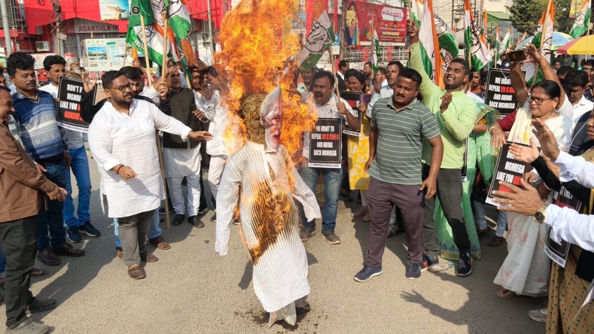 আগরতলা : এমজিএনরেগা প্রকল্পের নাম পরিবর্তনের সিদ্ধান্তকে ঘিরে রাজ্য রাজনীতিতে ফের উত্তাপ ছড়াল। রবিবার আগরতলা কংগ্রেস ভবন থেকে শুরু হয় এক বিক্ষোভ কর্মসূচি। বিক্ষোভ শেষে প্রধানমন্ত্রী নরেন্দ্র মোদির কুশপুতুল দাহ করেন কংগ্রেস কর্মী-সমর্থকেরা।