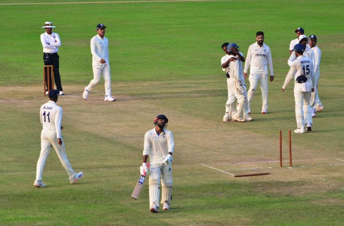 প্রতিকূল পরিস্থিতির কারণে আজ, রবিবার ম্যাচের দ্বিতীয় দিনেও খেলার অনেকটা সময় কমিয়ে নিতে হয়েছে। শনিবার প্রথম দিনে ৬০ ওভার খেলা হয়েছিল। আজ দ্বিতীয় দিনে হয়েছে ৫৫ ওভার। ত্রিপুরা দল কিছুটা কাম ব্যাক করতে পেরেছে, বাংলার ৮টি উইকেট দখল করতে পেরে, ১৬৫ রানের বিনিময়ে। মোটকথা, দ্বিতীয় দিনের খেলা শেষে সফরকারী বাংলা ১১৫ ওভারে নয় উইকেট হারিয়ে ৩৩৬ রান সংগ্রহ করেছে। দলের পক্ষে ওপেনার সুদীপ কুমার ঘরামির ১০৮ রান, শাকির হাবিব গান্ধীর ৯৫ রান বেশ উল্লেখযোগ্য। পাঁচ রানের জন্য সেঞ্চুরি হাতছাড়া করে গান্ধীকে প্যাভিলিয়নে ফিরে আসার সময় আফসোস রেখে আসতে হয়েছে।