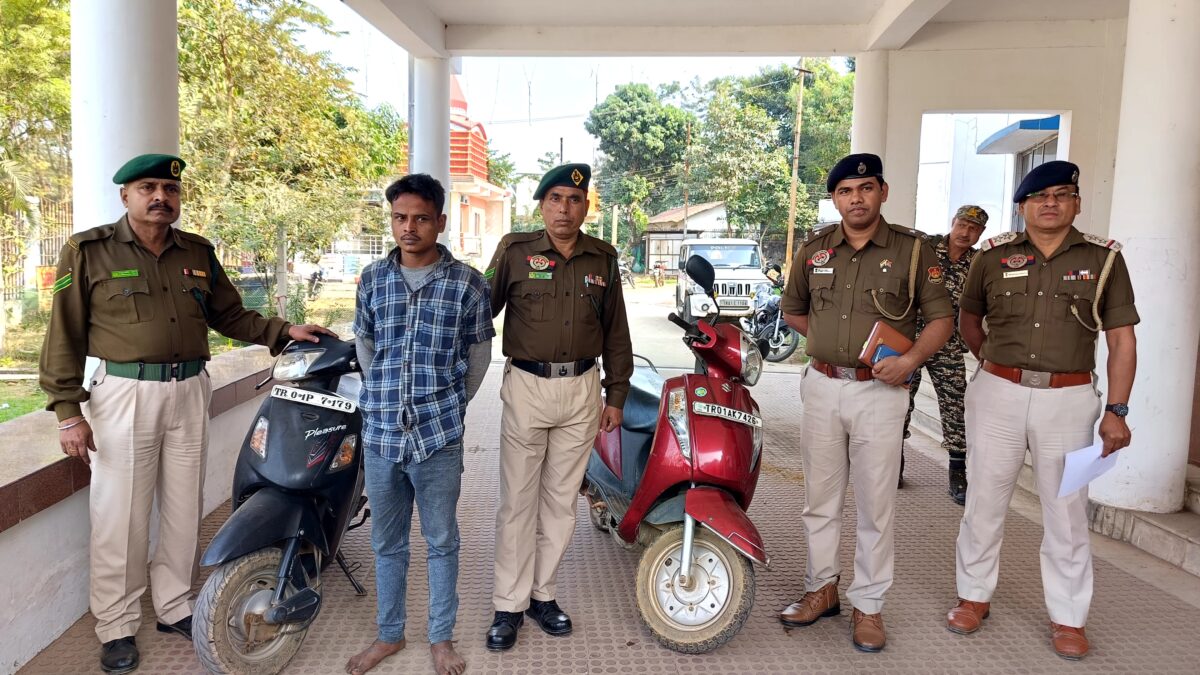 আগরতলা : রাজধানীতে স্কুটি চুরির ঘটনায় সাফল্য পেল এনসিসি থানার পুলিশ। দুটি চুরি যাওয়া স্কুটি উদ্ধারসহ সুমন নমঃ নামে এক অভিযুক্ত চোরকে আটক করেছে পুলিশ। রবিবার এই ঘটনার বিস্তারিত তথ্য সংবাদ মাধ্যমের সামনে তুলে ধরেন এনসিসি থানার ওসি প্রাজিত মালাকার।