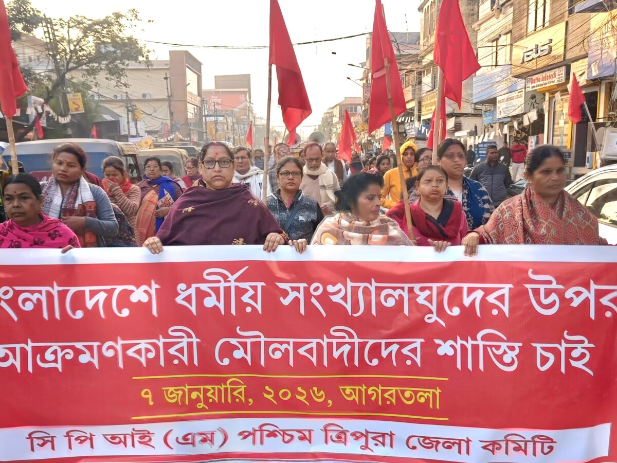 আগরতলা :বাংলাদেশের চলমান অরাজক পরিস্থিতি, সংখ্যালঘু মানুষের উপর নৃশংস মৌলবাদী আক্রমণ ও সাম্প্রদায়িক সহিংসতার অভিযোগ নিয়ে বুধবার পশ্চিম জেলা সিপিআইএম কমিটির উদ্যোগে আগরতলায় বিক্ষোভ মিছিল সংঘটিত হয়।মিছিলটি শহরের বিভিন্ন পথ পরিক্রমা করে পরবর্তী সময়ে একটি পথ সভায় মিলিত হয়। বিকেলে উপস্থিত ছিলেন পশ্চিম সিপিআইএম জেলা কমিটির সম্পাদক রতন দাস, সিপিআইএম রাজ্য সম্পাদক মন্ডলী সদস্য মানিক […]